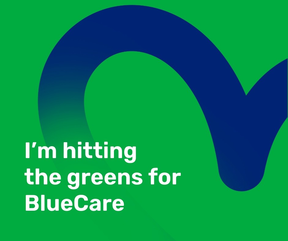 a social tile with a green background and text that says I'm hitting the greens for BlueCare.