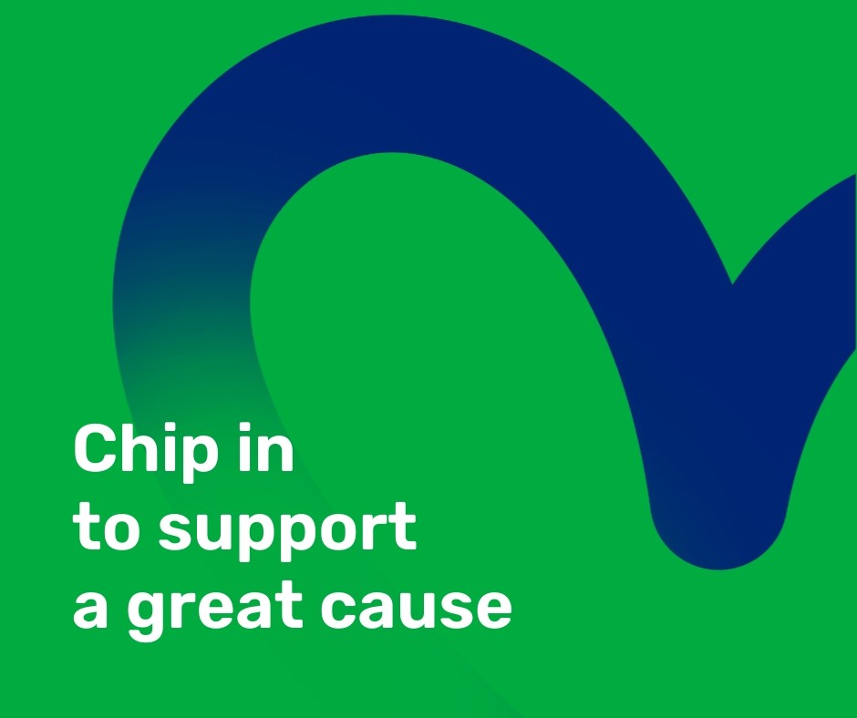 a social tile with a green background and text that says Chip in to support a great cause