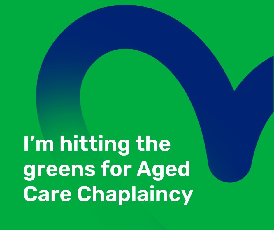 a social tile with a green background and text that says I'm hitting the greens for Aged Care Chaplaincy
